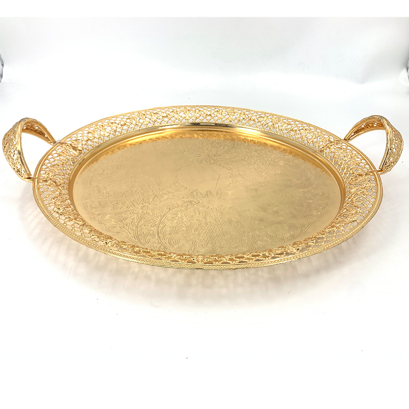 Gold decorative tea coffee tray for bar dresser table dessert jewelry and perfume with handles round.