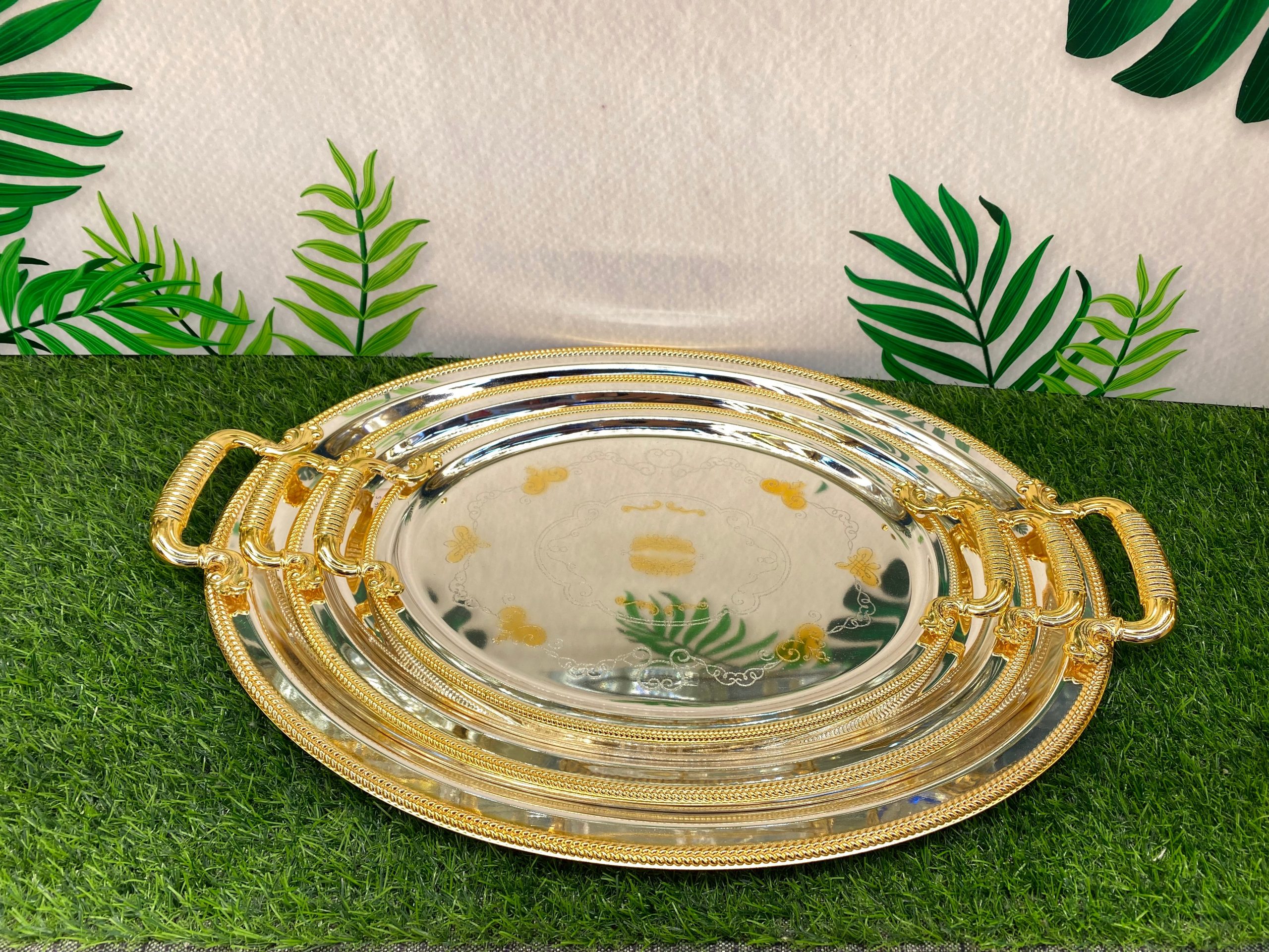 Oval three-piece tray set with alloy handle